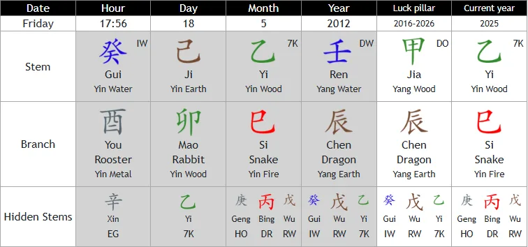 After inputting your birth details, look for the column labeled “Day.” If the top character is 壬 (Ren) and the bottom is 辰 (Chen), you are indeed a Water Dragon Day Master.
