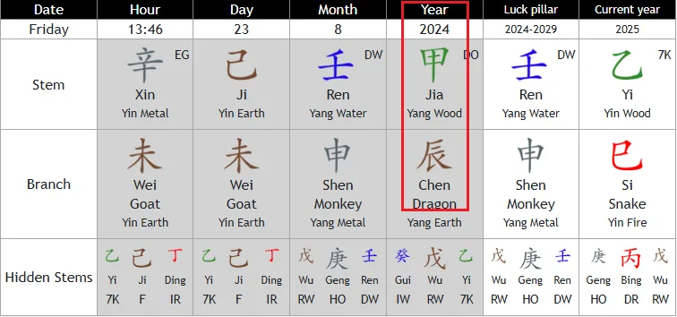 Because the Chen (辰) Dragon contains water and soil, the tall tree of Jia (甲) has a solid foundation to root itself and grow. People with this pillar are often visionary, stable yet ambitious, and possess hidden talents that they reveal only when the time is right.
