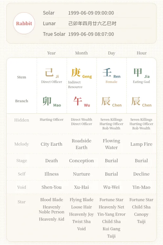 Simply enter your birth year, month, day, and hour, and our Free BaZi Calculator will instantly generate your personalized Four Pillars (BaZi) chart.
