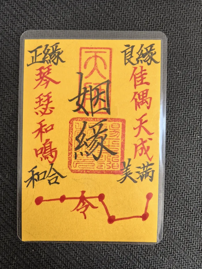 這位道家 愛情與關係護身符卡 此符由道教大師依照傳統符籙法門繪製並加持。符文如「良緣」、「福緣」、「命定伴侶」、「和諧」及「完美愛情」等,象徵著正向的關係能量、情感和諧與圓滿的連結。.